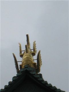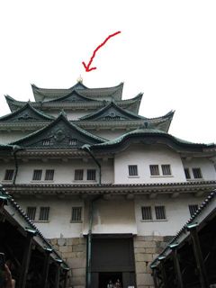 左の写真の矢印先、しゃちほこを同じ位置からズームしていくと右の写真に。